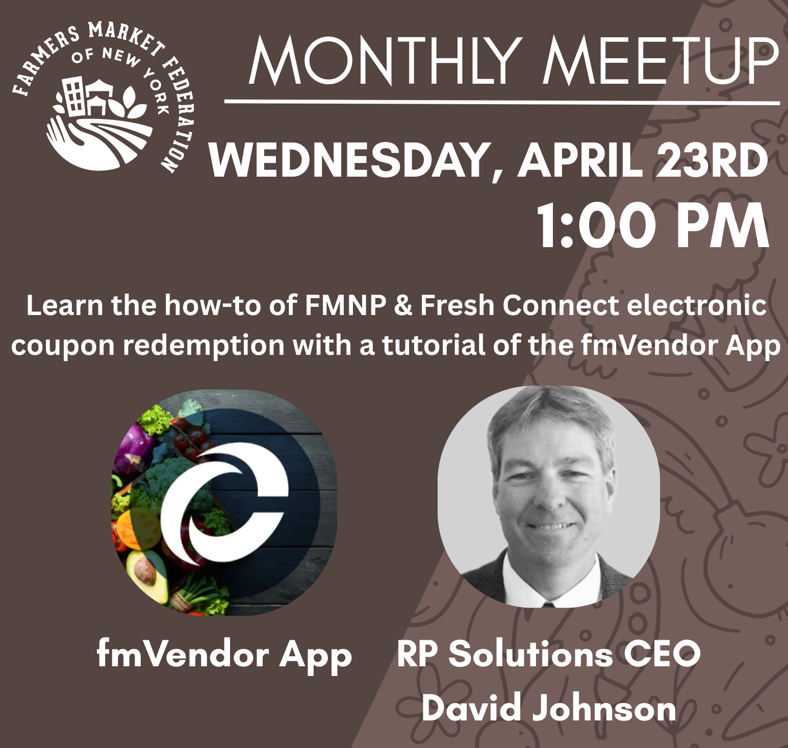 Join us for our next Monthly Meetup, coming up on Wednesday, April 23rd at 1 PM, to learn about the fmVendor App. This app is available to electronically redeem FMNP and Fresh Connect coupons this season. David Johnson, CEO of RP Solutions, will join us for a tutorial of how to register, redeem coupons, and troubleshoot on the app.